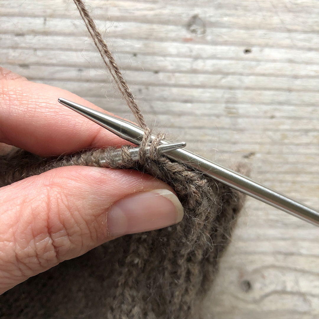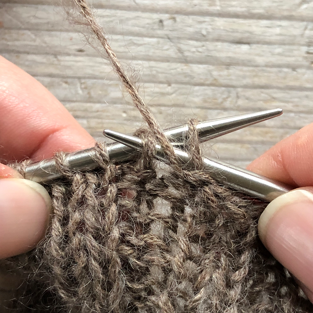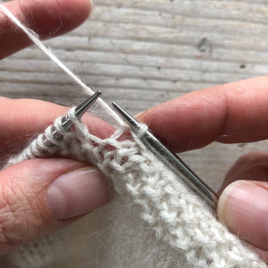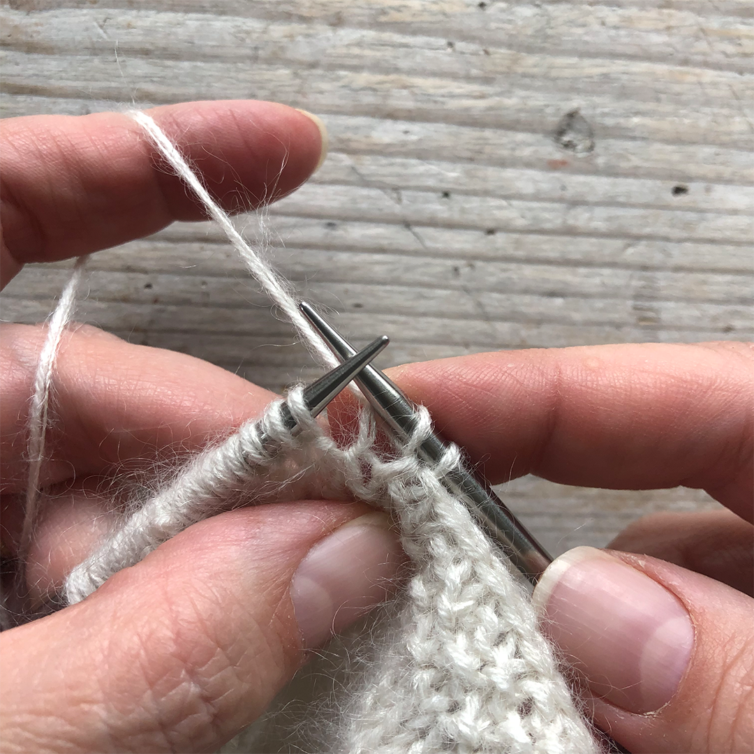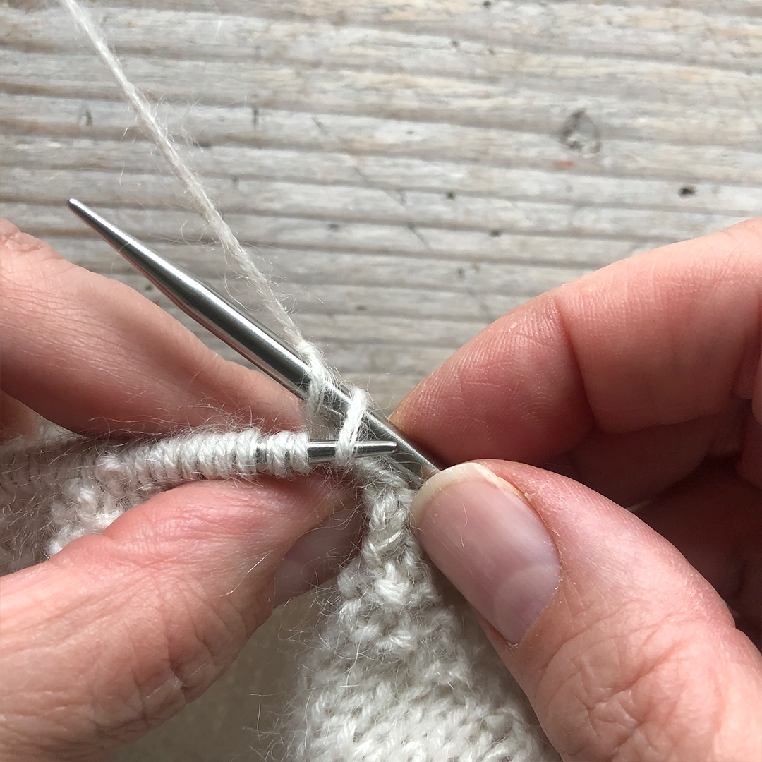 Jag stickar den första räta maskan rät MEN sätter tillbaka den på vänster sticka, sedan stickar jag två räta maskor ihop i bakre maskbågen.