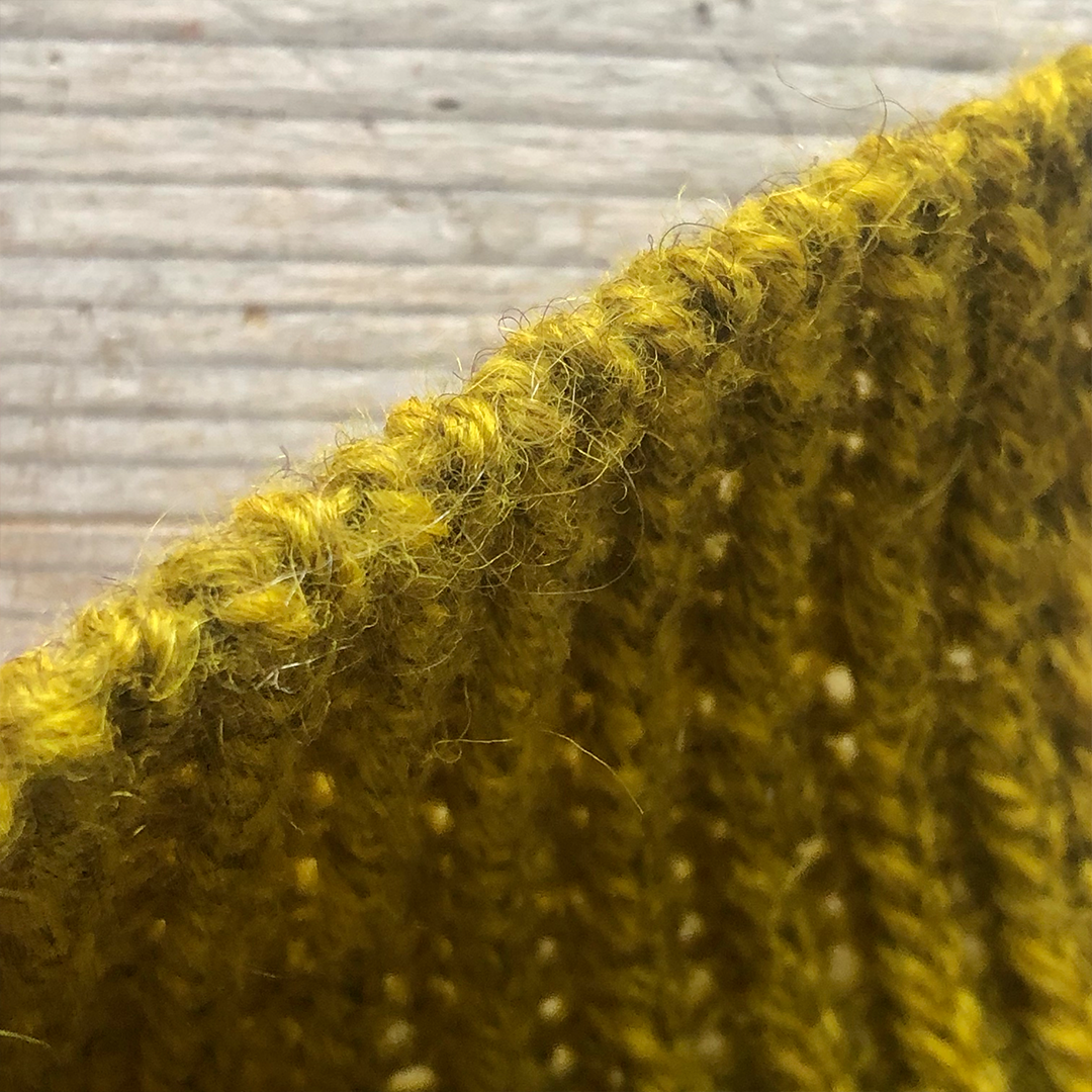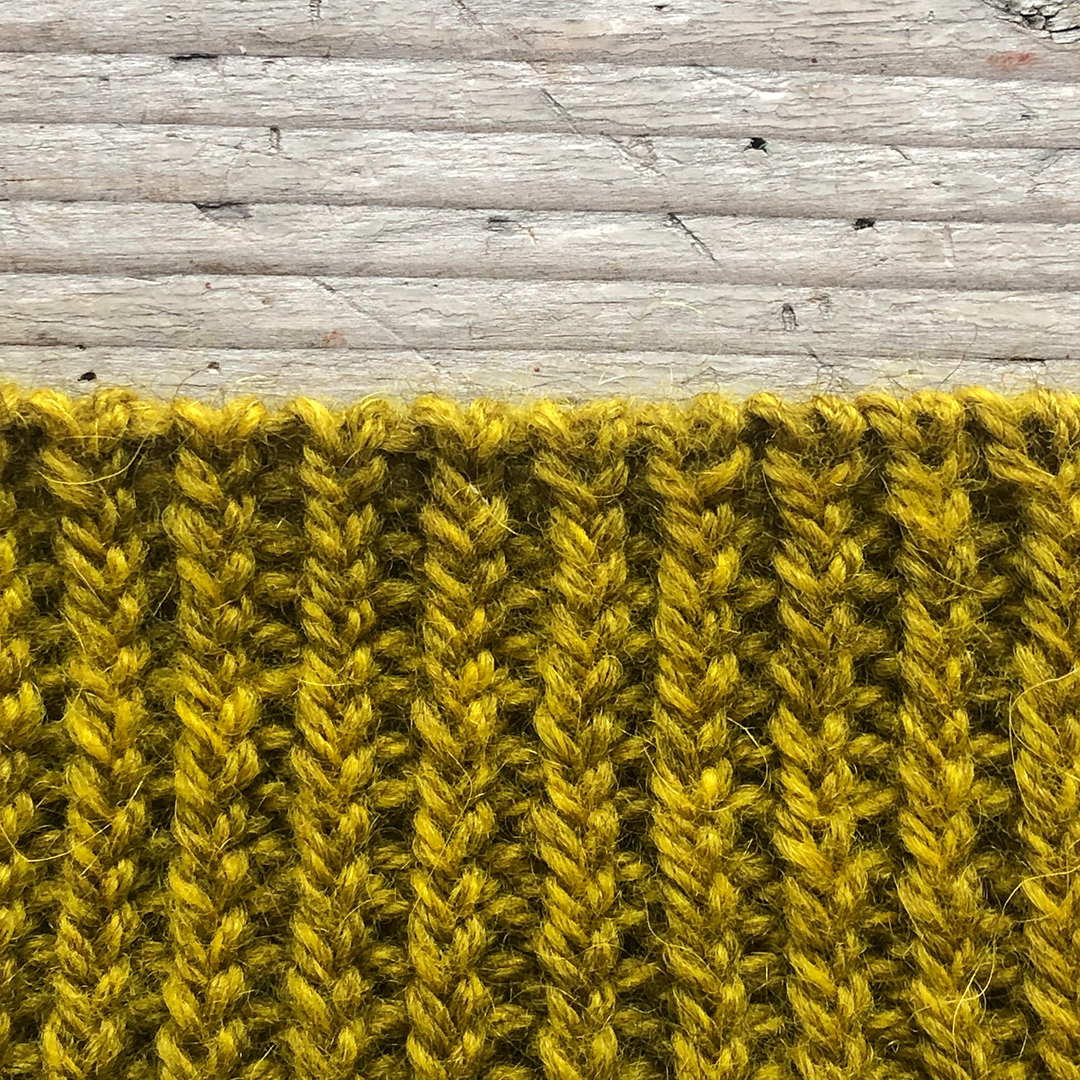 Den elastiska avmaskningen använder jag ibland till ärmavslut och nedtill på en tröja, om jag vill ha en lite mer töjbar kant. I exemplet talar jag om en resår stickad 2x2, alltså 2 räta 2 aviga, men det går lika bra med 1x1 resår eller vilken resårtyp som helst för att räta stickas räta och aviga stickas avigt oberoende av hur resåren är designad.