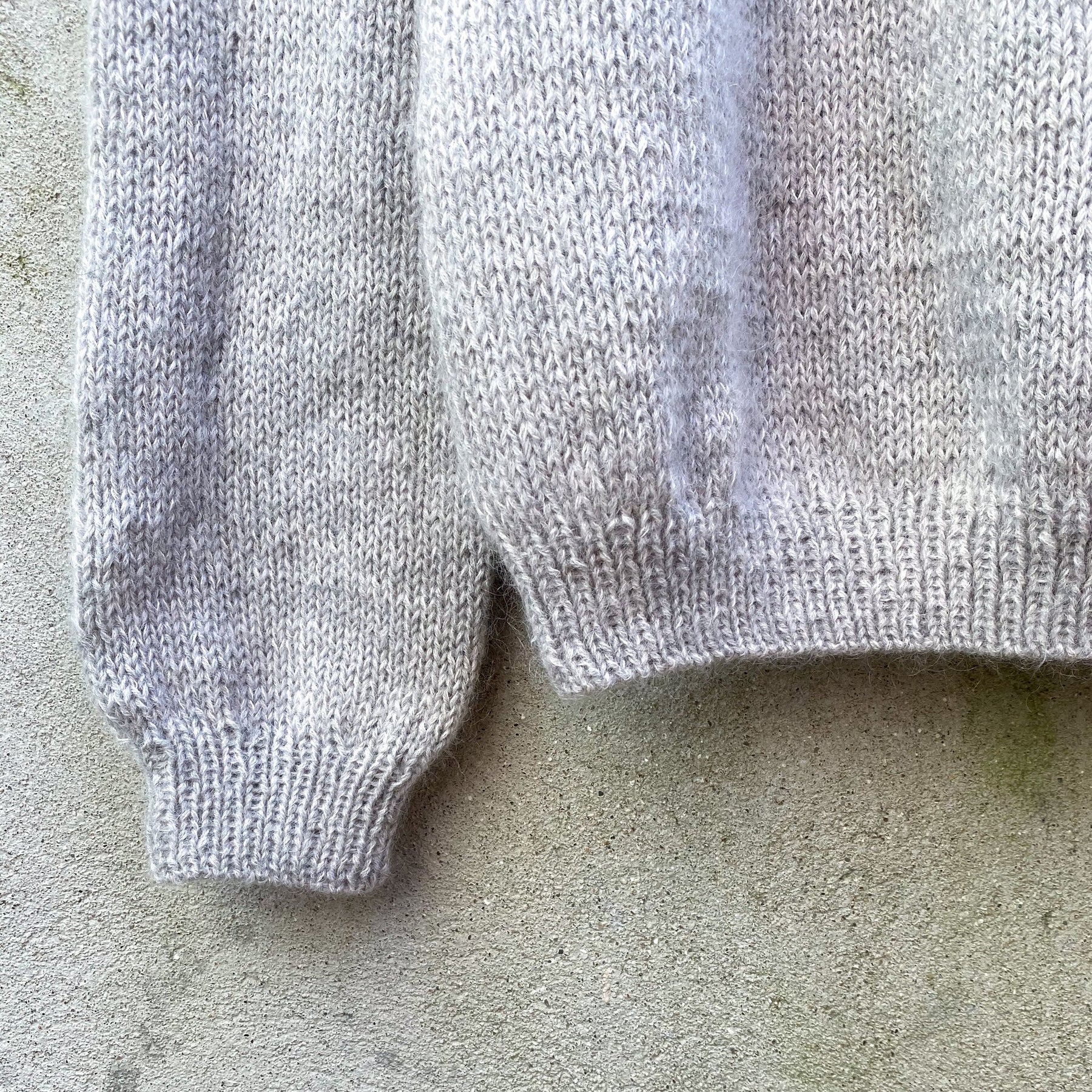 Till en M går det åt 250g Merino (5 nystan) och 125g Mohair (5 nystan), denna garnkombination ger ett mjukt, varmt och lätt material, men här vill vi byta ut garnet mott ett med lite tyngd och sticka med enkelt garn.