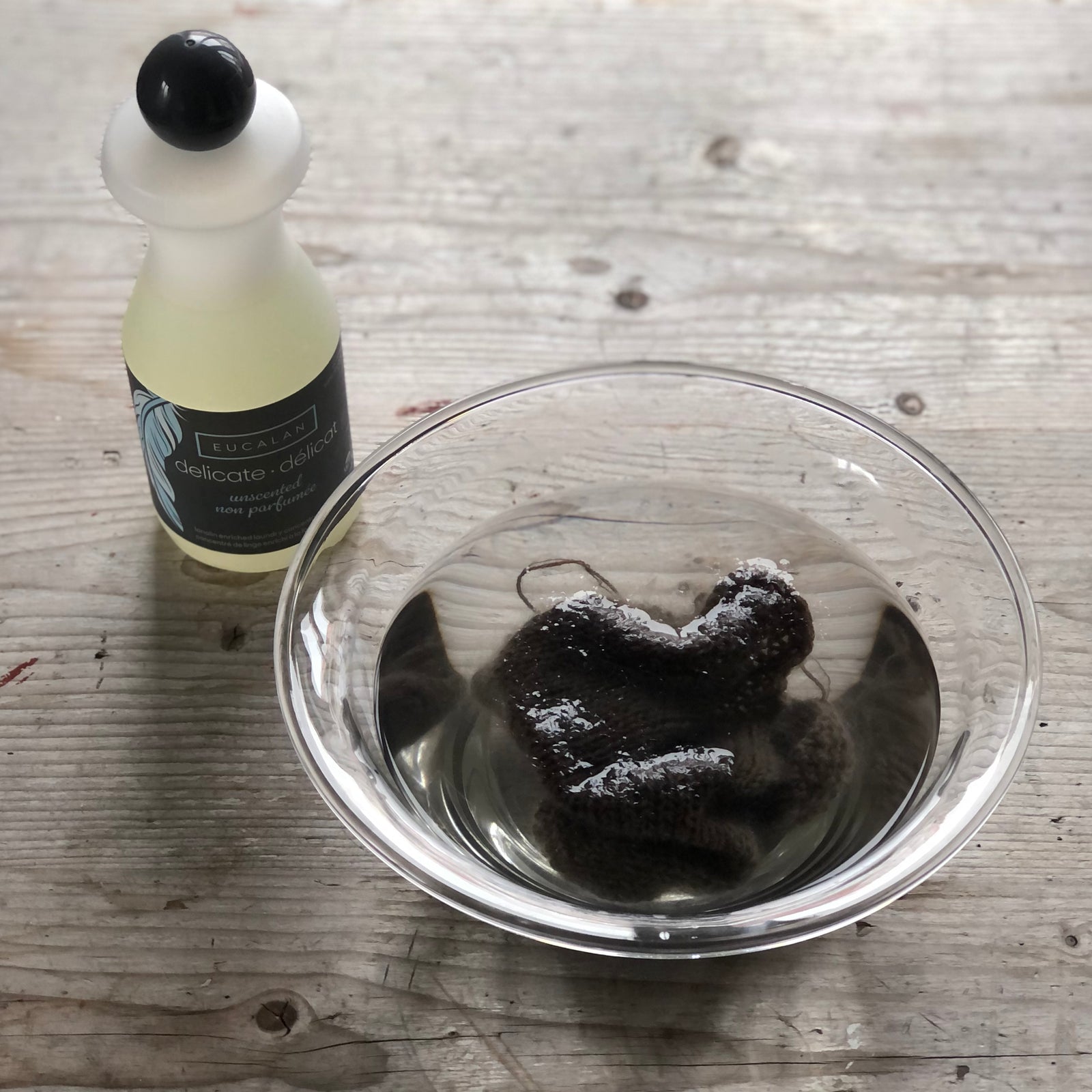 Innan vi mäter bör vi tvätta provlappen i ljummet vatten som vi kramar ur ordentligt och sedan lägger den att torka plant. Våtspänna eller blocka, som vi också säger. Detta för att provlappen skall bete sig på samma sätt som det färdiga plagget när vi tvättat och plantorkat det.