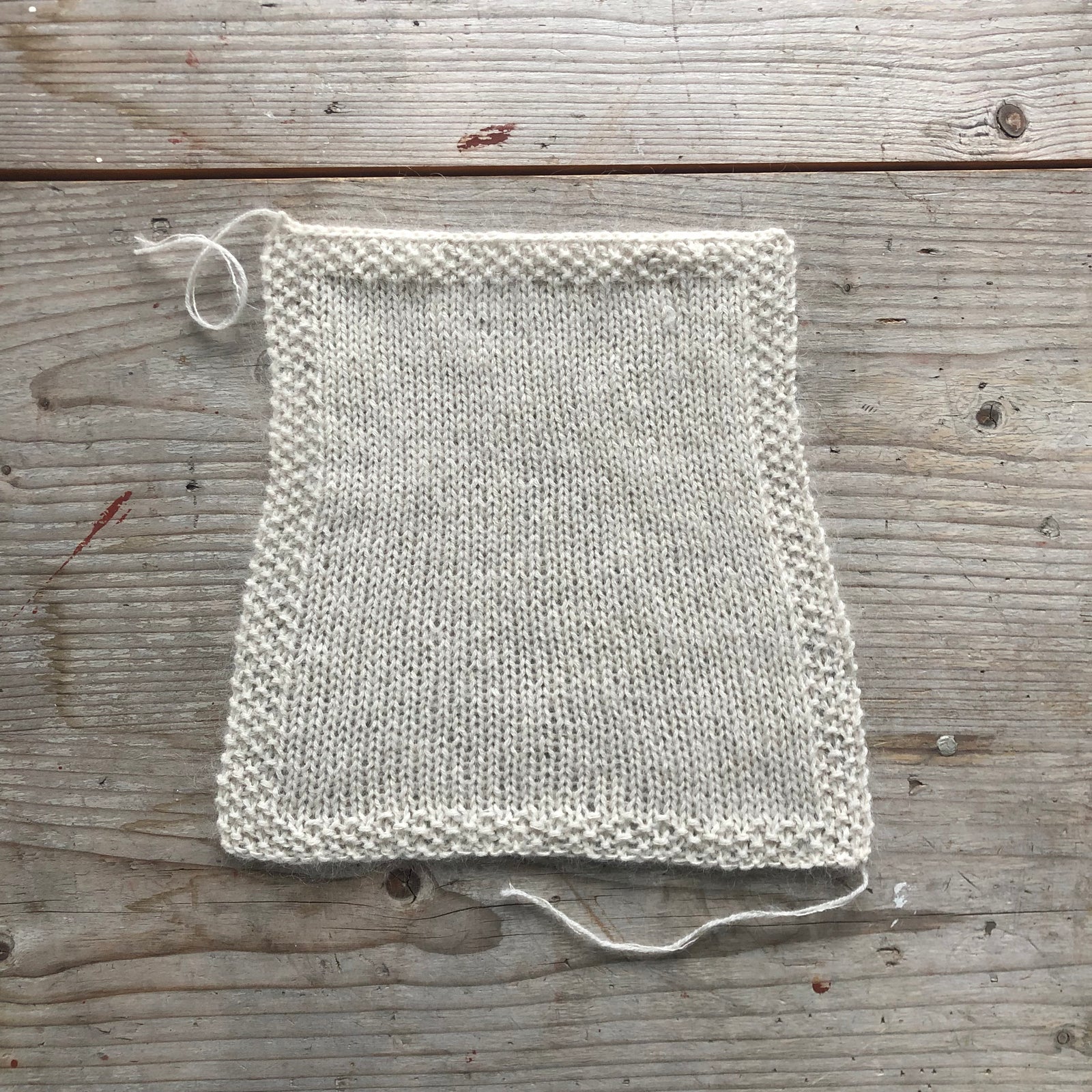 Det kan skilja en del med att bara ändra ett halvt nummer på sticka. På den vita provlappen här har jag börjat nertill att sticka med stickor 4,5 mm för att efter ungefär halva byta till stickor 4 mm.