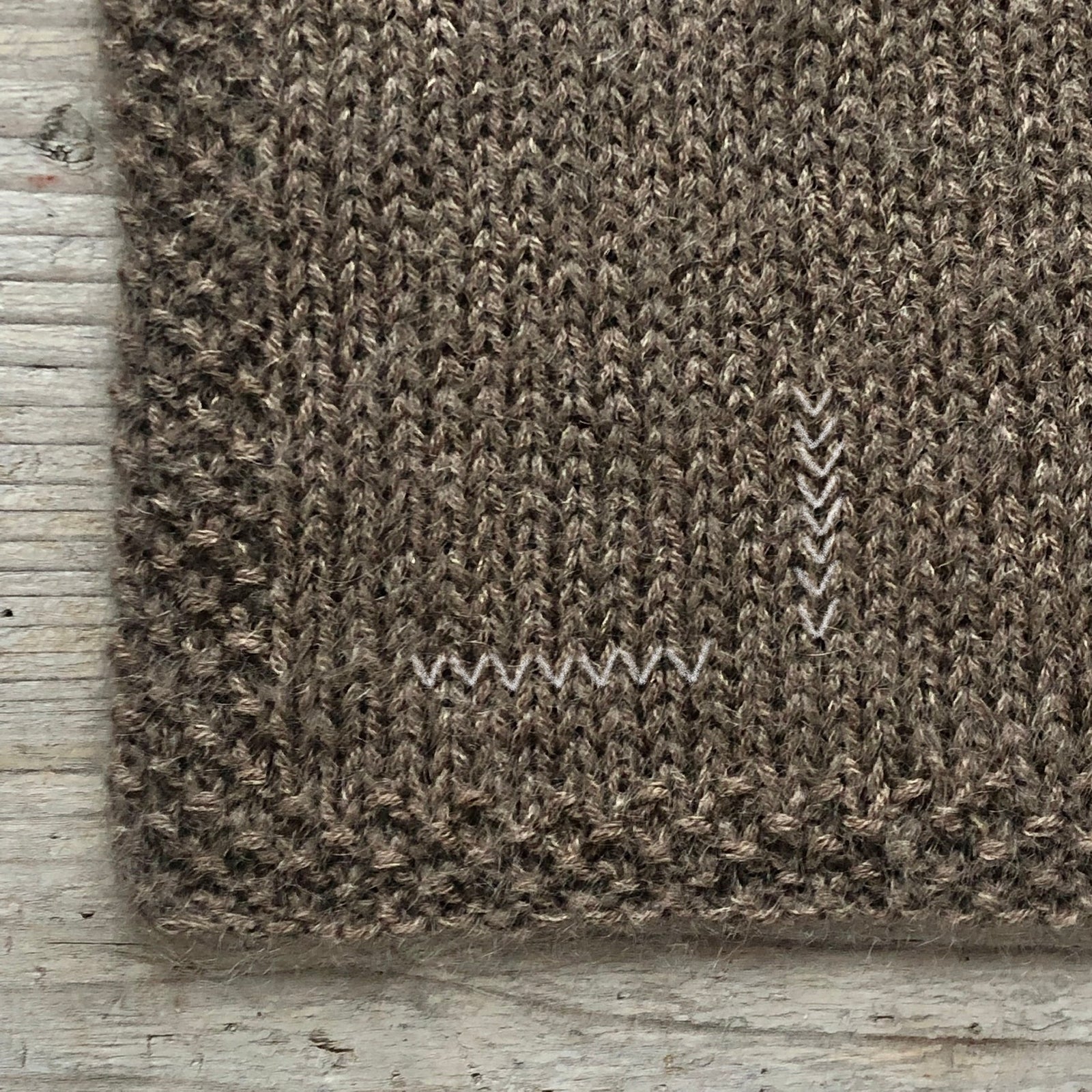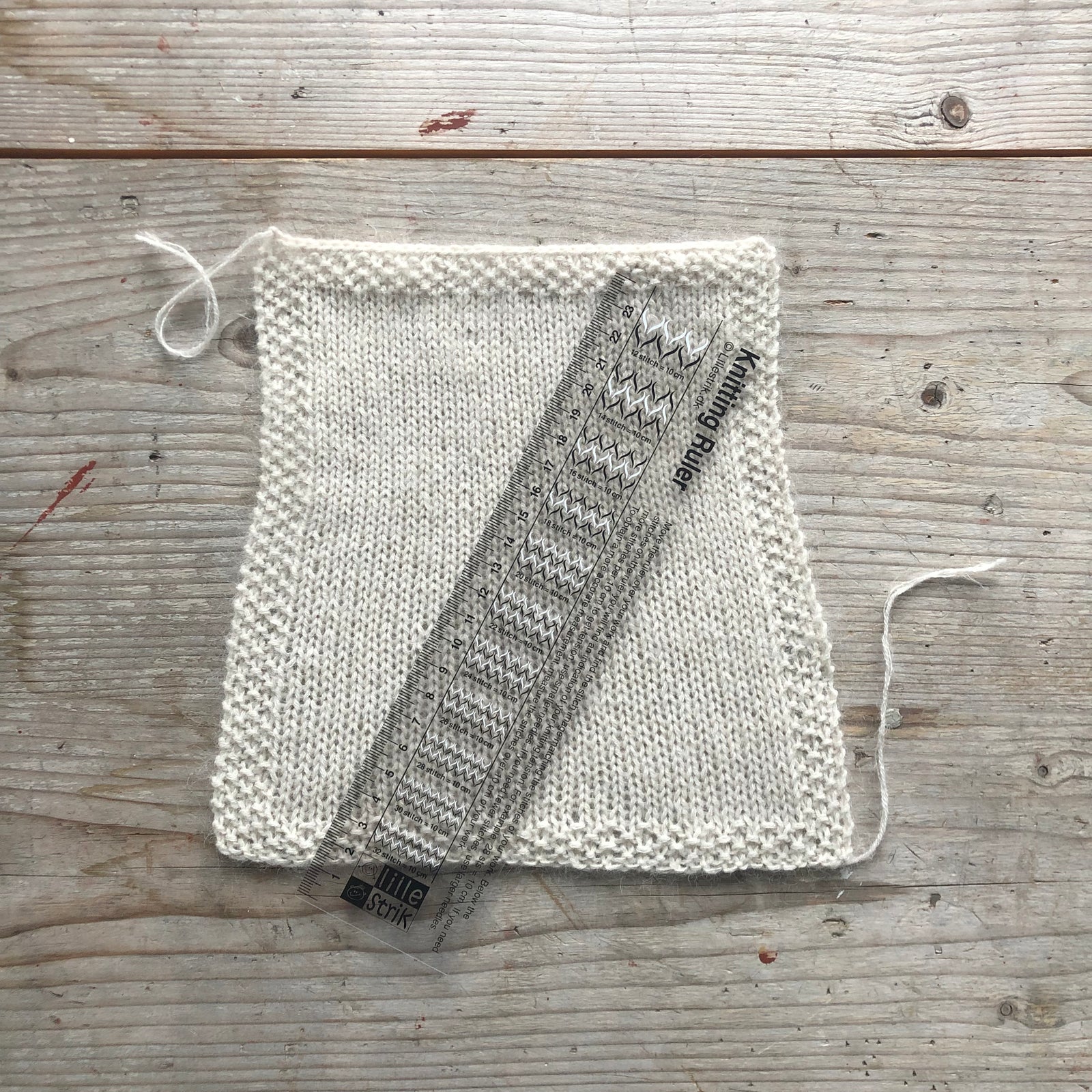 Den vita provlappen har nertill en masktäthet på 20 maskor och upptill en täthet på 22 maskor.