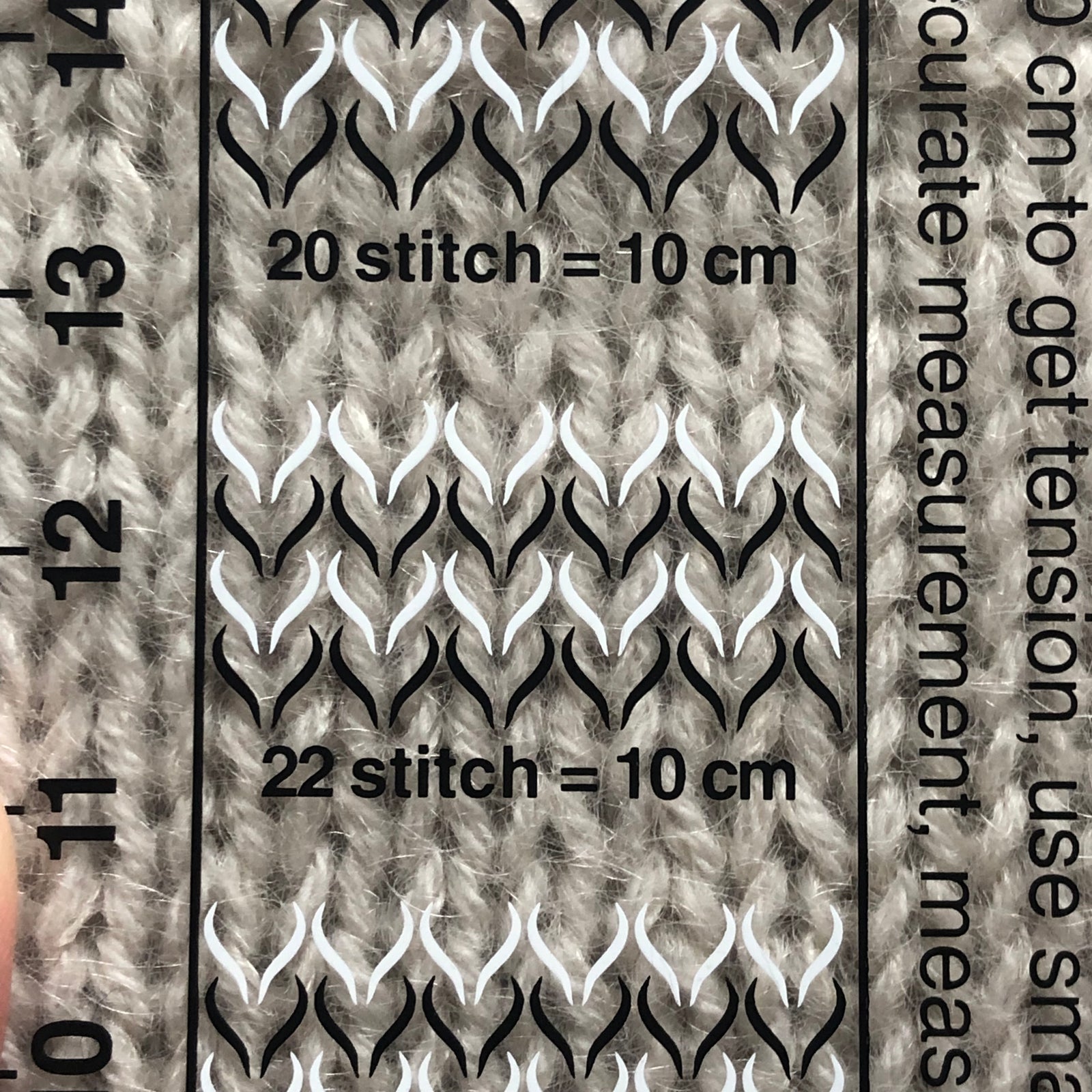 Maskemålern mäter inte heller varven genom sina tryckta maskor så det är en linjal på sidan av den. Därför har jag övergått till att säga masktäthet istället för stickfasthet, där vi även räknar varven.